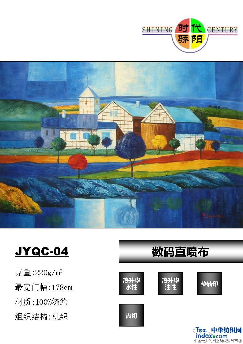 1.什么是數(shù)碼直噴布? 答:就是把低能量的分散染料制作成數(shù)碼打印墨水通過數(shù)碼直噴機(jī),打印在特殊處理的化纖布上,通過加熱,可以在最短的時間內(nèi)將圖像制作到精美的化纖布料等材質(zhì)上,非常適合個性化發(fā)展的市場需要和環(huán)保的要求。這種可以吸收固定墨水并且可以從布料一邊將墨水轉(zhuǎn)移到另外一邊,由驕陽旗材開發(fā)保證畫面層次和輪廓清晰的布,叫做數(shù)碼直噴布。其使用的墨水大多是由紡織用的分散染料配制的。分散染料由于其飽和的色彩和良好的耐候性,所以在紡織印染上有著廣泛的應(yīng)用。色譜齊全,色彩鮮艷,著色強(qiáng)度好;色牢度、水洗度達(dá)到4級以上,.比之傳統(tǒng)通過轉(zhuǎn)印紙的方式,直印布料提供了更優(yōu)質(zhì)的畫面和更銳利的邊緣效果。環(huán)保,不需要使用轉(zhuǎn)印紙,減少了對環(huán)境的影響。增加操作的便捷性,避免由于轉(zhuǎn)印紙的移動、折疊、扭曲而導(dǎo)致的錯誤。