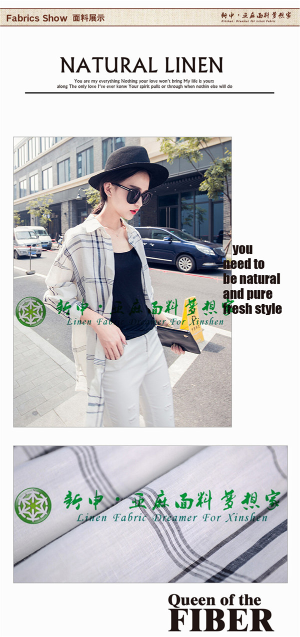 優(yōu)質(zhì)純亞麻寬松落肩休閑格子女襯衫面料