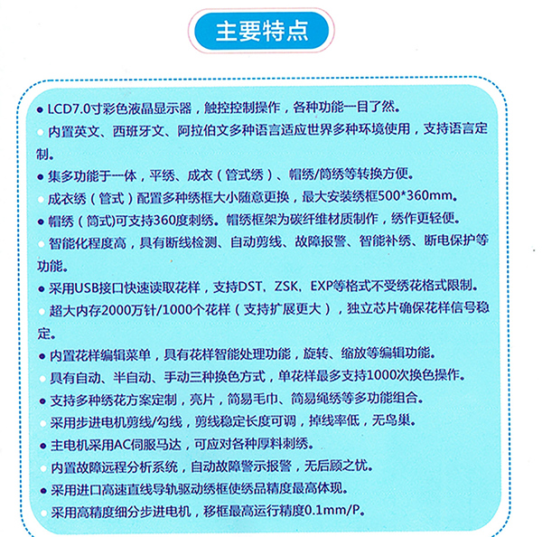 輔助功能 繡框限位/斷電保護/故障報警/緊急關(guān)機