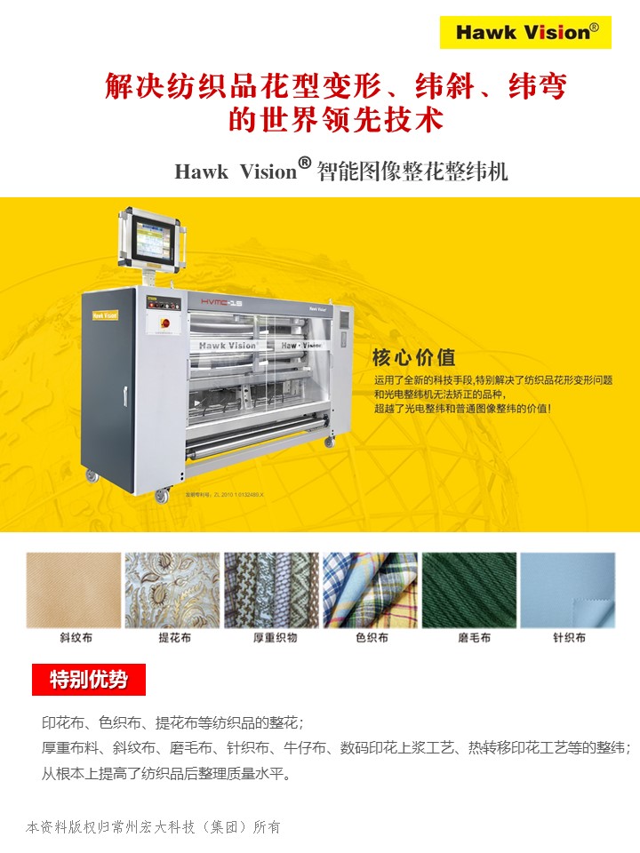 Hawk Vision 智能圖像整花整緯機一體機,是“霍克威視”品牌依托其強大的歐洲技術(shù)背景和常州宏大深厚的技術(shù)研發(fā)實力,首創(chuàng)國際領(lǐng)先的“全幅掃描整花整緯技術(shù)”,全幅掃描可大于8000個監(jiān)測點,徹底解決了光電整緯無法矯正和識別的紡織品花型變形、緯斜、緯彎問題,超越了光電整緯和普通圖像整緯的價值!系統(tǒng)具有廣泛的品種適應性,除了適用于光電整緯的全部品種,還適應光電整緯無法正常識別和矯正的品種,如色織布、提花布、厚重織物、斜紋布、磨毛布、針織布、牛仔布、印花布等,大大提高了紡織品后整理質(zhì)量水平,實現(xiàn)了紡織品智能整花、整緯的革命性突破,開啟了紡織品整花、整緯的新時代!該裝備已在國內(nèi)多家優(yōu)秀企業(yè)成功使用,收效顯著,提升了企業(yè)的市場競爭力,為客戶創(chuàng)造了核心價值。