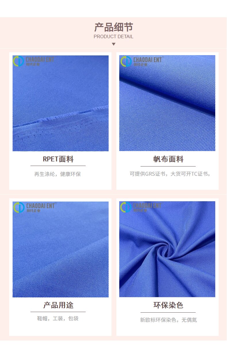 關(guān)鍵字:再生面料,2/2斜帆布面料,工裝面料,鞋帽面料