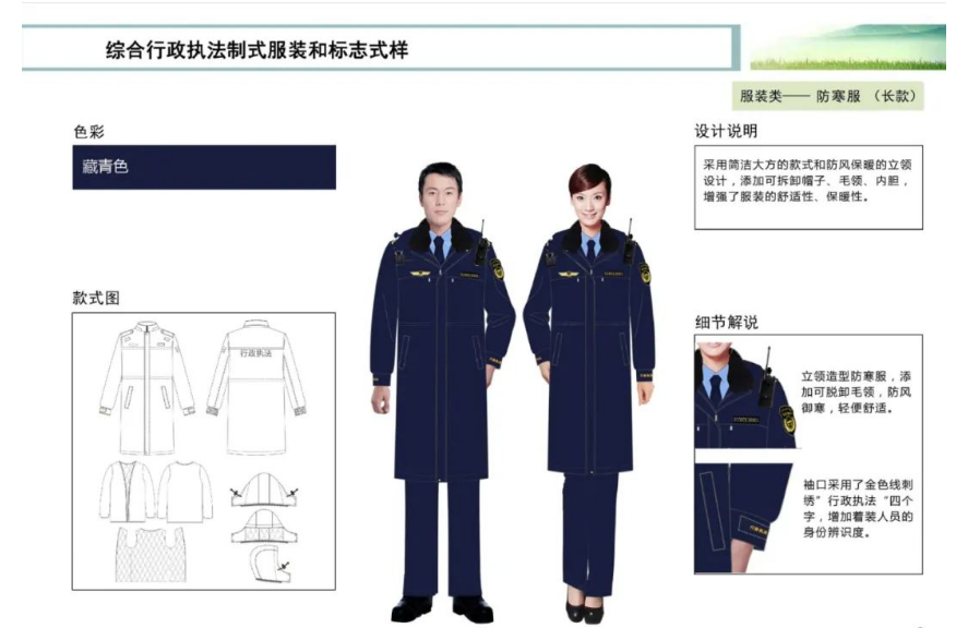 應(yīng)急管理綜合行政執(zhí)zhifa制式服裝和標(biāo)志包括帽類、服裝類、鞋類、標(biāo)志類等4大類18小類。主色調(diào)為藏青色,臂章通用圖案由盾牌、松枝及“中華人民共和國(guó)應(yīng)急管理zhifa”字樣組成,整體彰顯執(zhí)zhifa的權(quán)威性。盾牌內(nèi)圖案由五角星、齒輪、緊握的手、英文字母“EM”組成,象征應(yīng)急管理,整體表達(dá)堅(jiān)持安全發(fā)展、維護(hù)人民群眾生命財(cái)產(chǎn)安全和社會(huì)穩(wěn)定的理念。