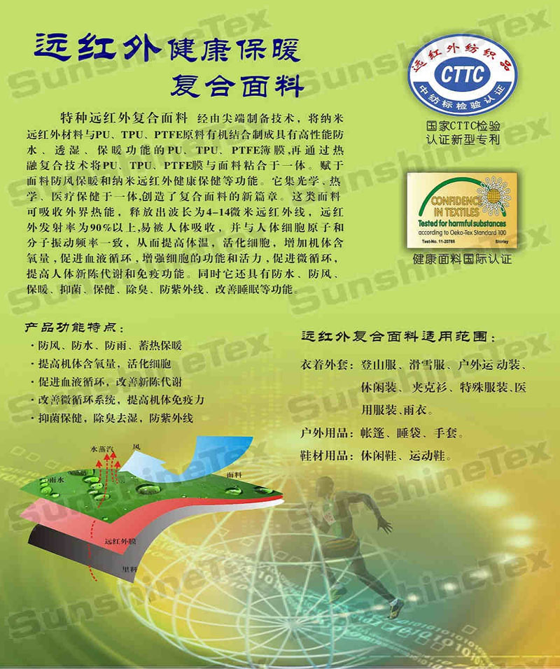 復(fù)合面料是一種高檔功能性面料,具備防風(fēng)保暖、耐磨擦、高防水、高透汽透濕、抗酸堿等功效,尤其是具備防水透濕功能的PU、TPU、PTFE復(fù)合面料,較普通防水透汽面料而言更具有手感柔軟、剝離牢度強(qiáng)、耐撕裂、抗水洗等諸多優(yōu)點(diǎn)。使您的身體保持長(zhǎng)久的干爽和舒適。