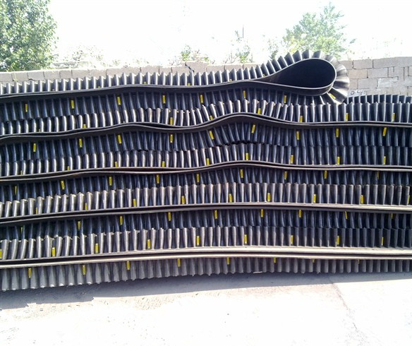 大傾角擋邊帶又叫裙邊隔板輸送帶, 是由基帶、擋邊、橫隔板3部分組成。擋邊起防止物料測(cè)滑撒落的作用。為便于繞過滾筒,檔邊設(shè)計(jì)成波紋狀;橫隔板的作用是承托物料,為了實(shí)現(xiàn)大傾角輸送,采用T型TC型。檔邊和橫隔板是用二次硫化的方法與基帶連接的,具有很高的連接強(qiáng)度。用于輸送易散落的粉狀、粒狀、小塊狀、糊狀及液態(tài)狀物料。其特點(diǎn):適用于傾角0°~90°散裝物料的輸送;具有使用范圍廣、占地面積小、無(wú)轉(zhuǎn)運(yùn)點(diǎn)、減少土建投資、維護(hù)費(fèi)用低、維修容易輸送量大 連續(xù)化、高效率、大傾角運(yùn)輸,操作安全,使用簡(jiǎn)便,,運(yùn)費(fèi)低廉,并能縮短運(yùn)輸距離,降低工程造價(jià),節(jié)省人力物力等特點(diǎn);解決了普通帶和花紋帶所不能達(dá)到的輸送角度;還可根據(jù)使用環(huán)境,設(shè)計(jì)成完整、獨(dú)立的輸送系統(tǒng),避免了間斷輸送和復(fù)雜輸送的提升系統(tǒng)。可沿水平、傾斜、垂直和變角方向輸送各種散裝物料,從煤、礦石、沙子到化肥和糧食等。物料粒度不限,可從很小的粒度到